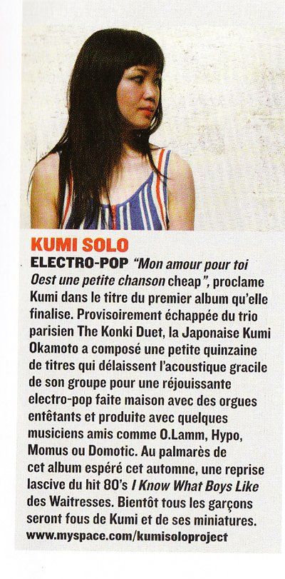 Une fois arrivée, elle joue à la boulangère comme Kiki la petite sorcière, vend des habits aux parisiennes, tout en suivant des cours de cinéma pour décortiquer tout le charme de la Nouvelle Vague. Mais elle n’est pas venue seule du Japon, elle a aussi amené avec elle toute la musique qu’elle avait en tête. Elle devient une des trois filles du Konki Duet, pop électrisante, où se mêlent et s’emmêlent japonais, français et anglais. Puis Kumi se transforma en Kumisolo, pour accomplir seule une musique entêtante bercée de diverses inspirations allant de Bob Dylan à Elli et Jacno. Évoluant sans cesse, Kumi est partout à la fois.