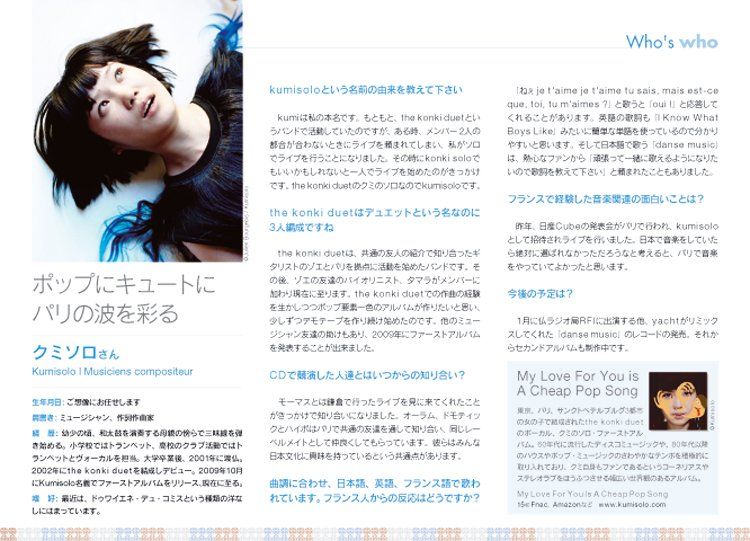 そこに着くと、彼女は魔女の宅急便のようなパン屋を演じ、パリジャンに服を売り、映画のレッスンを受けてニューウェーブの魅力をすべて分析します。しかし、彼女は日本から一人で来たのではなく、彼女が考えていたすべての音楽も持ってきました。彼女はの3人の娘の1人になります コンキデュエット、日本語、フランス語、英語が混ざり合う、感動的なポップ。その後、クミはクミソロに変身し、ボブ・ディランからエリー、ジャクノに至るまで、さまざまなインスピレーションに揺さぶられた派手な音楽を自分で演奏しました。絶えず進化している久美は、同時にどこにでもいます。